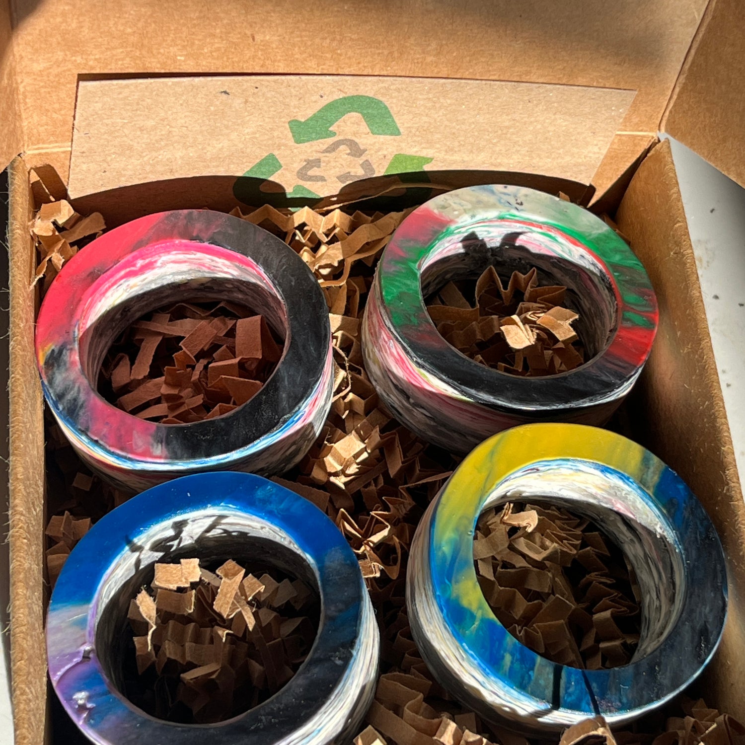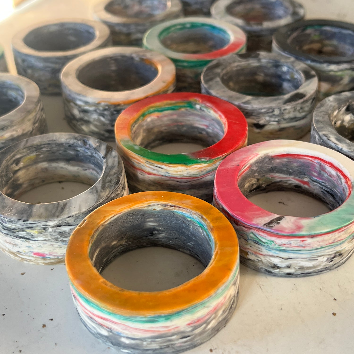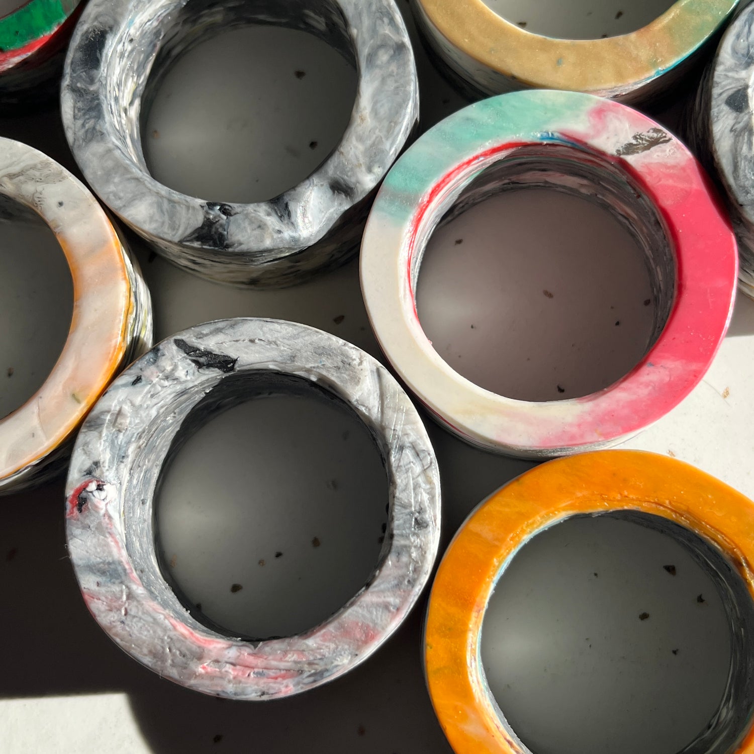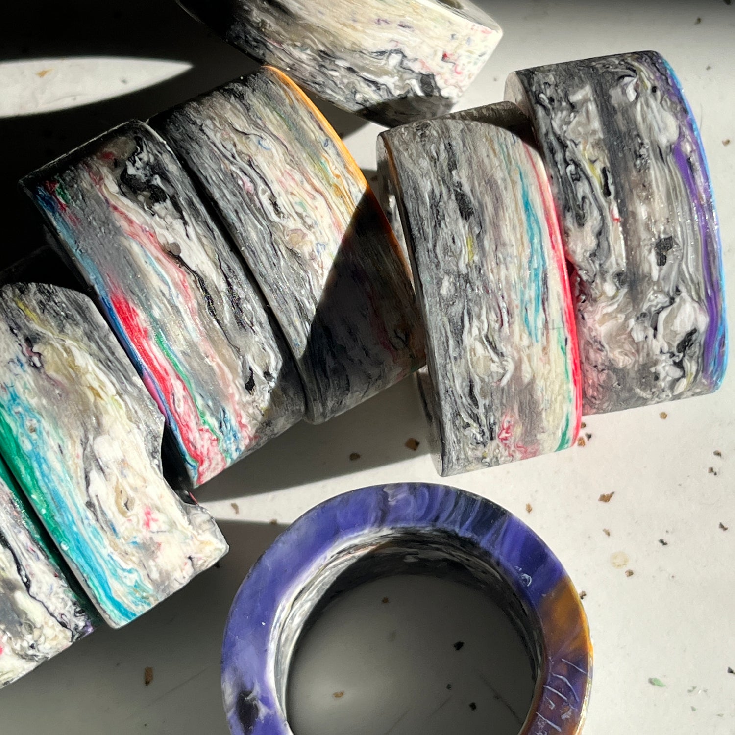 These napkin rings are all unique—no two are alike! Each one features a swirled pattern with hues ranging from grey and white marbling to luminous purples, greens, and pinks.