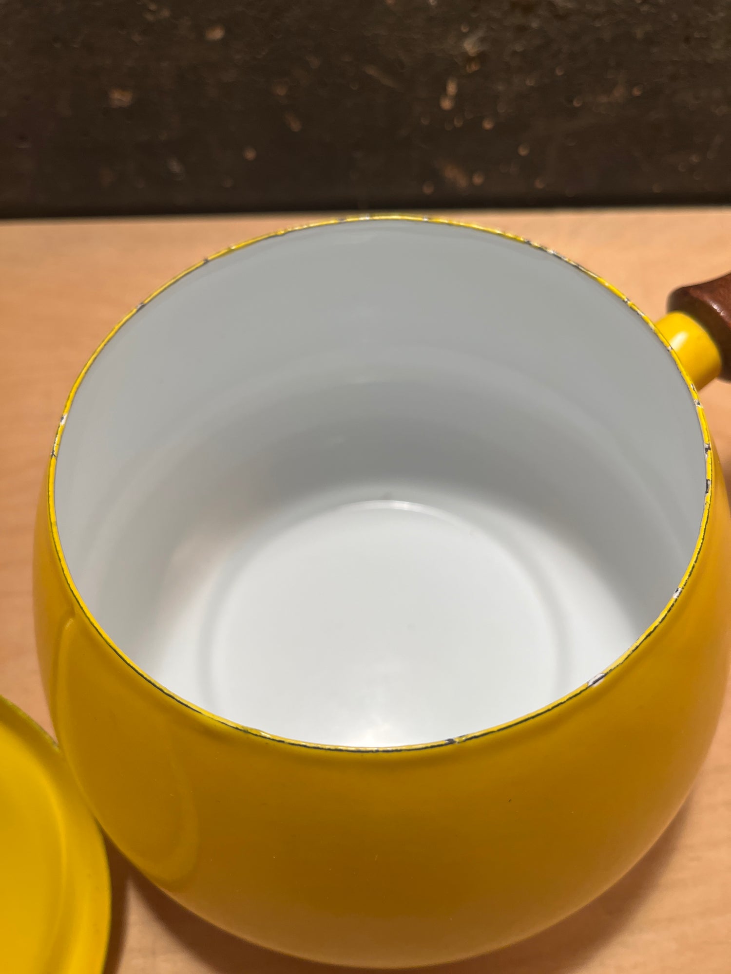 Fondue pot - vintage enamel sunshine yellow with wood handles
