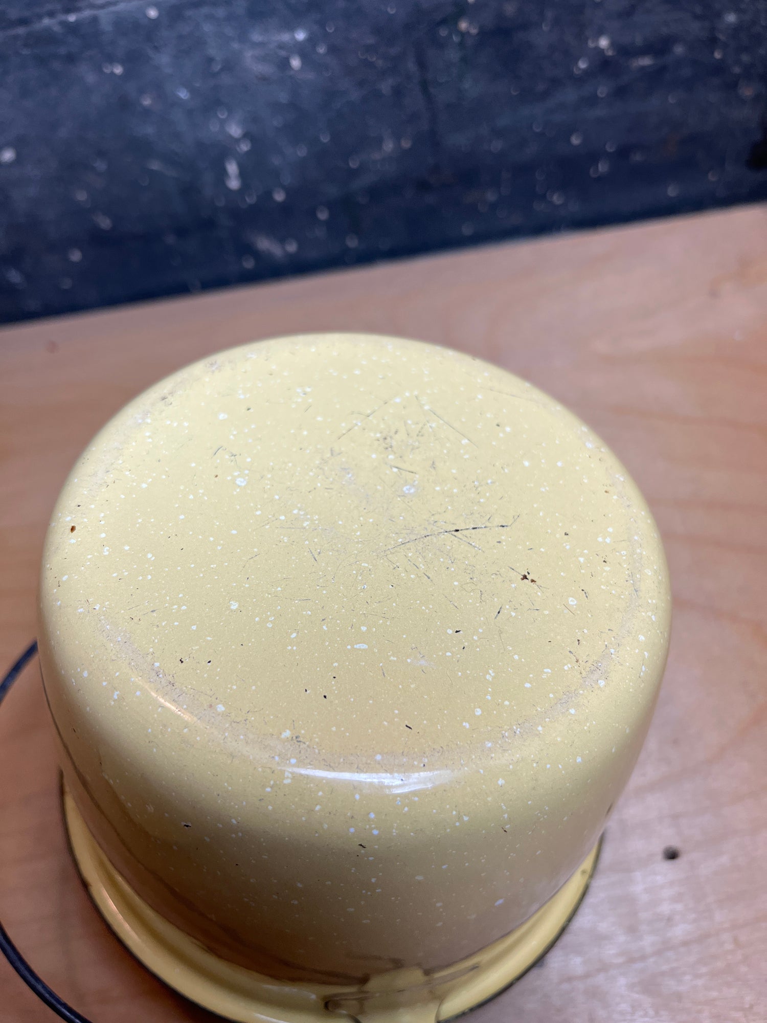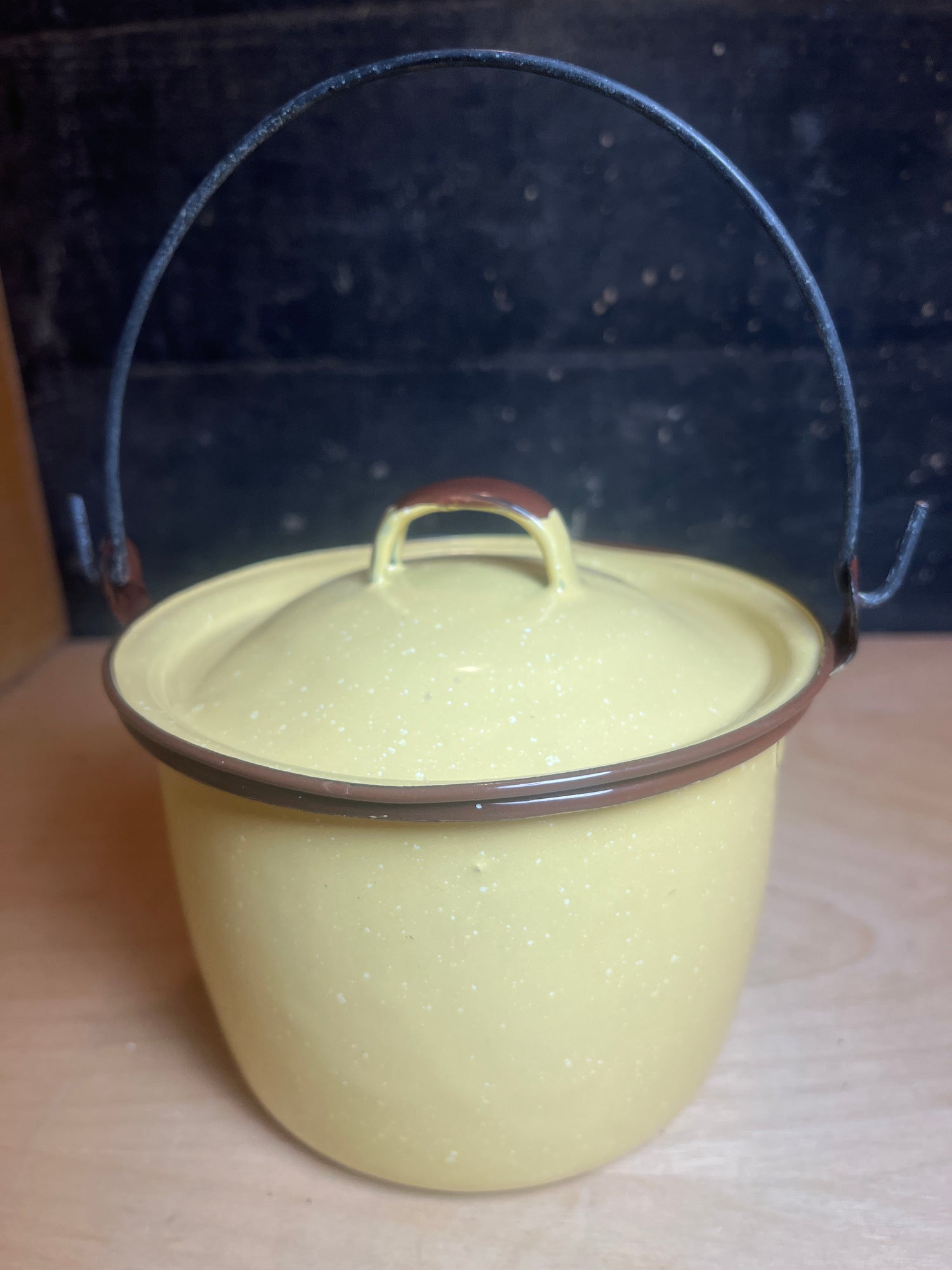 Mini pot with lid and wire handle - vintage enamelware in yellow with brown accents is backordered and will ship as soon as it is back in stock.