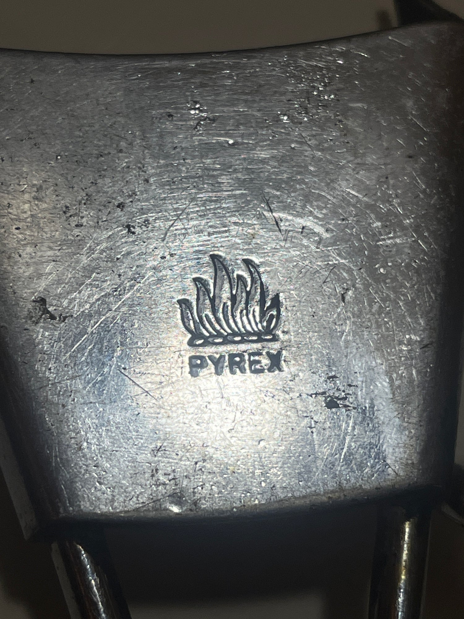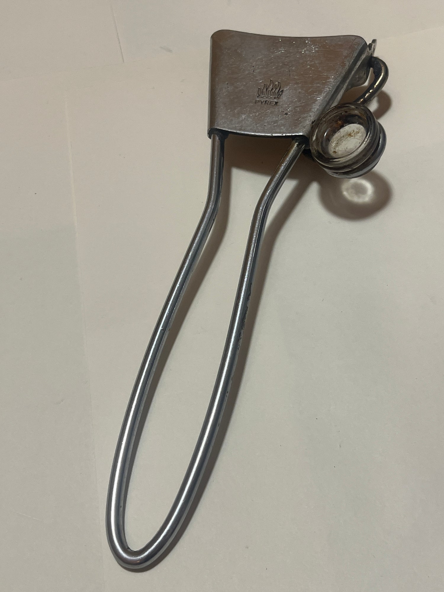 This PYREX stainless steel handle is in great condition with signs of wear from normal use. It is designed to be used with the Flameware collection from PYREX.